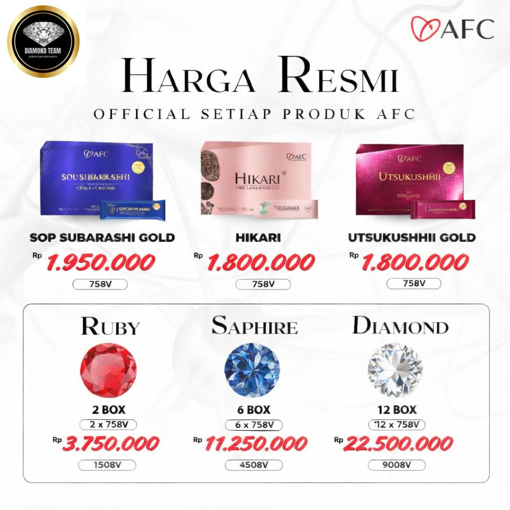 Produk AFC adalah minuman kesehatan masa depan yang dapat membantu mencegah hingga membantu memperbaiki penyakit bawaan, seperti penyakit jantung, diabetes, stroke, dan kanker. Produk AFC juga dapat membantu regenerasi sel dalam tubuh.